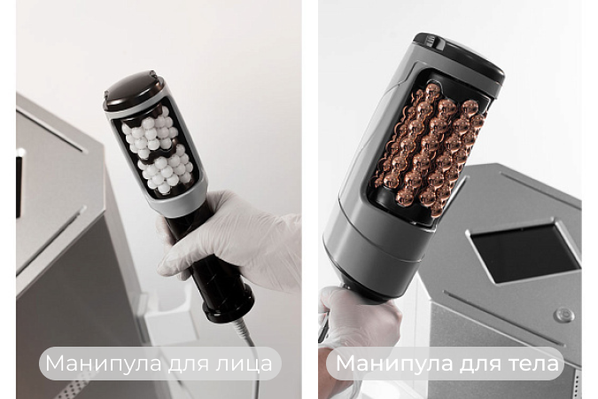 - Манипула для тела. Оснащена комплексом вращающихся сфер, оптимизированных для глубокого воздействия на крупные мышечные группы и подкожно-жировую клетчатку (бедра, ягодицы, живот, спина). Обеспечивает интенсивный лимфодренажный массаж сферами и коррекцию объемов.