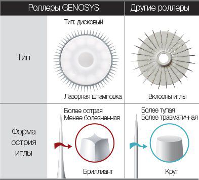 Дермароллеры этой марки создаются по самым строгим европейским стандартам, они зарегистрированы в FDA. Их запатентованная форма игл имеет алмазную заточку. Кроме того, иглы толщиной 0,2мм имеют одинаковый угол наклона около 6 градусов, благодаря чему тончайшие иглы легко и практически вертикально проникают в кожу. Форма игл обеспечивает минимальную травматизацию и скорейший реабилитационный период. Мезороллеры Genosys из нержавеющей стали имеют оригинальную дисковую конструкцию, в отличие от роллеров других марок с вклеенными иглами, во время использование которых есть риск выпадения игл. К услугам профессионалов предлагаются роллеры Genosys для лица, шеи и зоны декольте, периорбитальной зоны, для тела и роллер-штемпель для волосистой части головы.