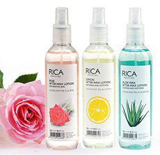 Лосьоны после депиляции, созданные RICA, быстро успокаивают кожу после депиляции, удаляют остатки воска. В состав формул входит комплекс натуральных масел, питающих кожу, придающих ей гладкость после депиляции. Масла, входящие в состав лосьонов, превосходно удаляют остатки воска и великолепно ухаживают за кожей. Масло подсолнечника питает, масло сладкого миндаля успокаивает и смягчает кожу, масло жожоба питает и защищает. Лосьоны содержат витамин Е, благодаря чему обеспечивают антиоксидантную защиту и смягчают кожу. Лосьоны с экстрактом розы, алоэ, мяты, лимона, авокадо предназначены для ухода за кожей различных типов после депиляции.