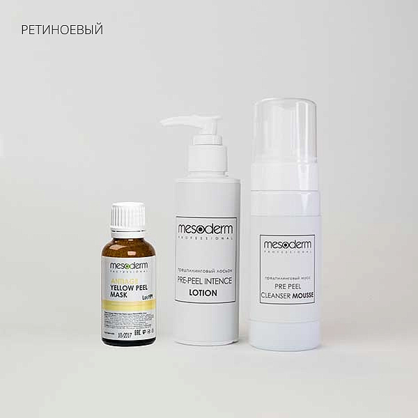 Протокол №9: Ретиноевый пилинг ANTIAGE YELLOWPEEL MASKПротокол №9: Ретиноевый пилинг ANTIAGE YELLOWPEEL MASKНабор препаратов для поведения профессиональной процедуры ретиноевого («желтого») пилинга Mesoderm. Включает в себя очищающий мусс и лосьон с невысоким содержанием АНА кислот, а также сам пилинговый состав.