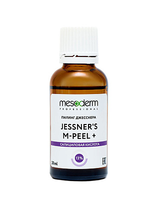 Модифицированный состав для пилинга Джесснера – комплекс молочной 12% и салициловой 13% кислот, резорцина 13% с добавлением АНА и РНА, предназначен для коррекции эстетических несовершенств проблемной, себорейной кожи. Кроме того, Jessner's M-Peel + рекомендован для устранения пигментных пятен, признаков инволюционных изменений, при гиперкератозе, неровном рельефе.