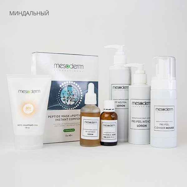 Пакет профессиональный препаратов для проведения миндального пилинга Mesoderm согласно протоколу. Состоит из самого пилингового раствора, а также вспомогательных пред- и постпилинговых продуктов для домашнего и салонного применения.