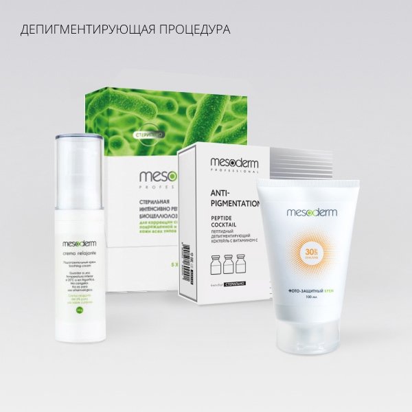 Профессиональный набор для проведения антипигментирующих процедур микронидлинга и ФММТ. Включает в себя основной препарат на основе пептидов с осветляющими свойствами, а также вспомогательные космецевтические средства согласно протоколу Mesoderm.