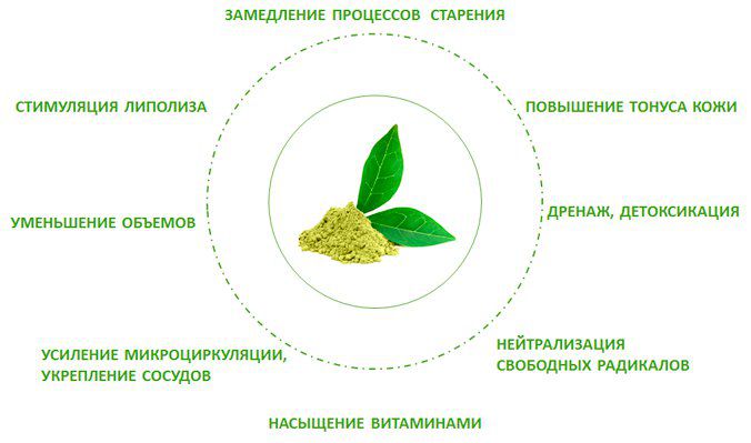Если взглянуть на состав обертывания, то основным компонентом препарата являются мелкодисперсные листья зеленого чая, действие которых дополняет экстракт овса и белая глина.