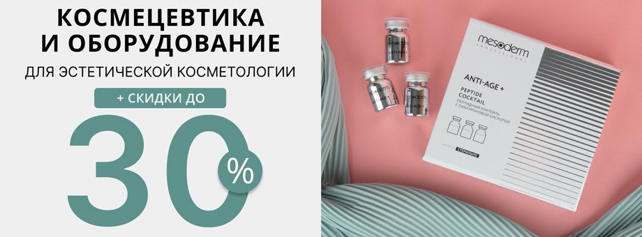Только сейчас действуют скидки до 30% на самые востребованные пептидные коктейли и оборудование для эстетической косметологии. Подготовьтесь к сезону мезотерапии с максимальной выгодой!