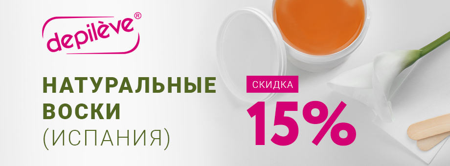 Дарим скидку 15% на самые качественные воски и косметику для депляции DEPILEVE! Натуральный пчелиный воск, масла оливы и карите, алоэ и чайное дерево – гарантия надежного результата депиляции без раздражения кожи и вросших волос.