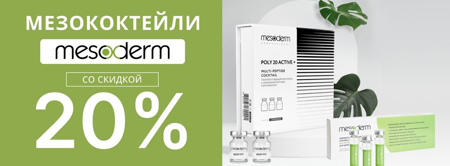 Зарабатывайте больше вместе с нами! Прямо сейчас самые востребованные мезококтейли Mesoderm для лица, периорбитальной области, против стрий и выпадения волос со скидкой 20%!