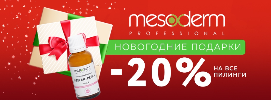 Невероятный новогодний подарок для вас и ваших клиентов! Миндальный и феруловый, азелаиновый и фитиновый, гликолевые с разным рН и ретиноевый желтый – заказывайте ВСЕ химические пилинги MESODERM прямо сейчас со скидками до 20%.
