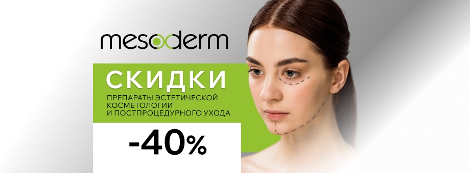 Не пропустите скидки до 40% на препараты для эстетической медицины! Предпилинговые и постпилинговые препараты, биоревитализанты MESODERM ждут вас и ваших клиентов.
