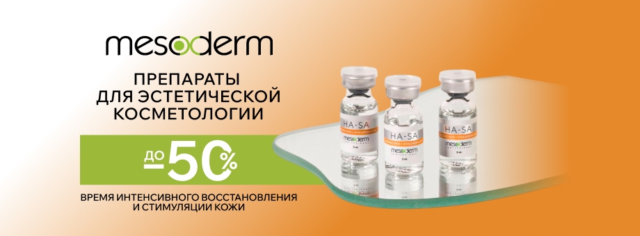Решите разом все проблемы ваших клиентов! Препараты для увлажнения и лифтинга кожи, устранения морщин и пигментации, а также для укрепления волос MESODERM прямо сейчас со скидками до 50%.