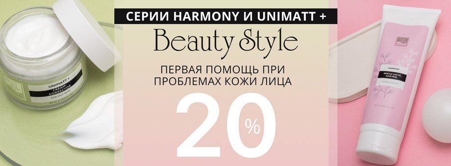 Скорая помощь при основных проблемах кожи лица летом! Включайте в регулярный уход своих клиентов продукты Harmony для реактивной и гиперреактивной кожи со склонностью к куперозу и UNIMATT + для жирной, смешанной и проблемной кожи от Beauty Style. А мы дарим вам скидку 20% на эти серии.