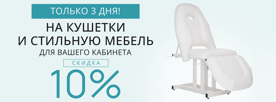 Только три дня! Не пропустите скидку 10% на лучшие варианты косметологических кресел и другой необходимой мебели для вашего кабинета. Пусть ваша работа будет качественной, удобной и стильной!
