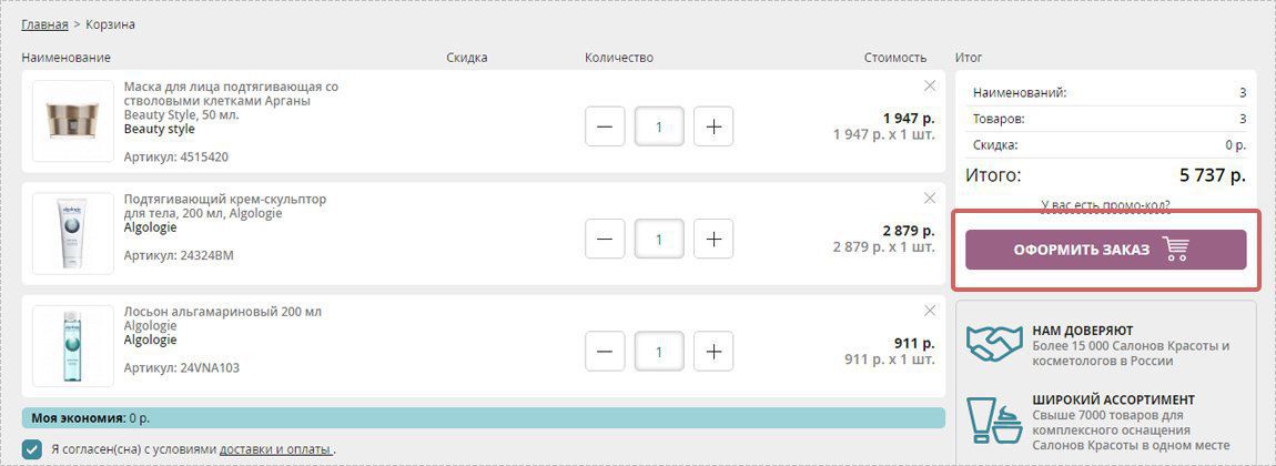 На странице Корзины Вы можете ознакомиться с составом Вашего заказа, предварительной минимальной стоимостью доставки, а также применить промо-код, если он у Вас есть.