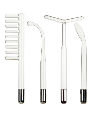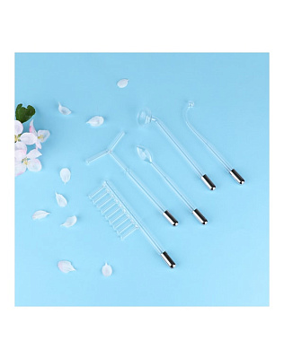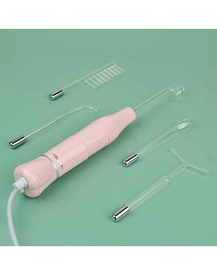 Специальная ручка на корпусе позволяет регулировать силу подачи импульсного тока. Аппарат имеет 5 съемных стеклянных электродов: капля, грибок, лепесток, расческа и Т-образная насадка. Они предназначены для работы по телу, лицу и по коже головы.