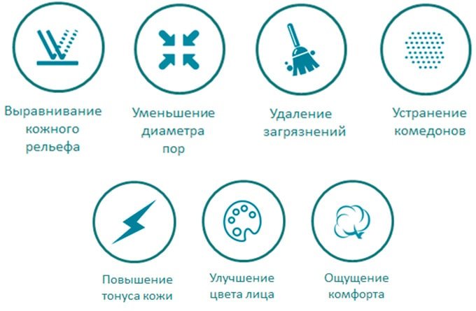 Очищение происходит максимально деликатно, удаляется слой старых клеток с поверхности кожи, очищаются поры и уменьшается их диаметр, улучшается кровообращение, активизируются процессы дыхания в клетках, кожа очищается от накопленных загрязнений и токсинов.