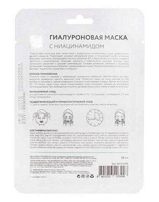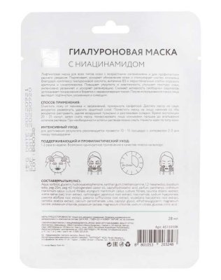 Маску с гиалуроновой кислотой и ниацинамидом также рекомендуется применять для профилактики раннего старения и ускоренной потери влаги после 30 лет, во время путешествий и частых перелетов, в периоды восстановления после стрессов, болезней.