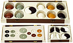 Набор из 12 камней 5-ти полудрагоценных пород (мрамора, обсидиана, амазонита, сердолика, яшмы) имеют круглую форму с отверстием в центре и гладкую поверхность;