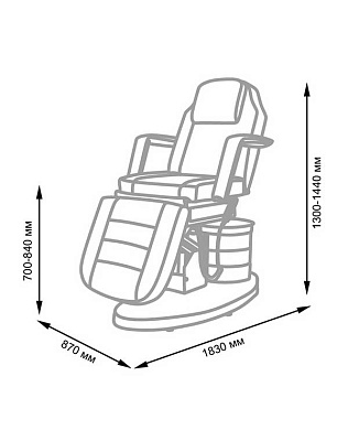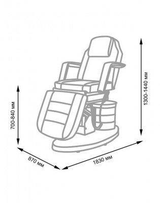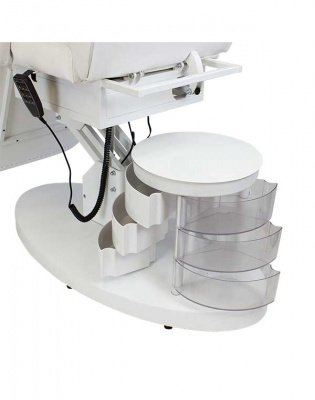 Большое и комфортное кресло имеет три мотора, отвечающих за одну подвижную часть. Данные регулировки позволяют подобрать оптимальное положение для клиента. Если есть необходимость трансформировать кресло в кушетку, можно снять подлокотники и подголовник. Под подушкой есть специальное отверстие для лица посетителей. В тумбочке мастер сможет хранить инструменты первой необходимости, что позволит быстро находить инструменты и косметику.