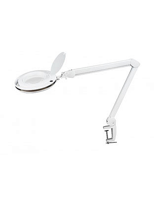 Бестеневая лампа со встроенной лупой является незаменимым инструментом для выполнения работ, требующих повышенной точности исполнения. Данная лампа может быть использована как в домашних условиях, так и в офисах, в лабораториях, в мастерских, в кабинетах маникюра и педикюра, и во многих других сферах человеческой деятельности, требующих повышенной точности при выполнении каких-либо операций. Данная модель оснащена кронштейном, позволяющим настроить высоту и угол наклона, струбциной для крепления к краю стола и кольцевой светодиодной лампой, состоящей из 60-ти светодиодов, общей мощностью 10 Вт. Мощность линзы - 8 диоптрий.