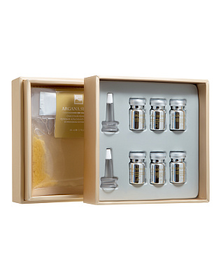 В состав набора входит сыворотка со стволовыми клеткам арганы и гелевая альгинатная маска с коллагеном, креатином, стволовым клетками арганы и коллоидным золотом. Препараты набора оказывают на кожу комплексное действие, усиливая и дополняя положительные эффекты, что позволяет получить видимый результат после первой процедуры.