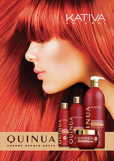 Рекламный плакат с изображением косметической продукции для волос марки Kativa.