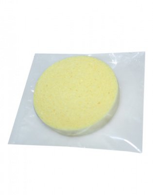 Спонж  круглой формы, диаметр  8,2 см. Предназначен  для использования в различных косметологических процедурах. Обеспечивает специалистам комфорт и удобство в работе.