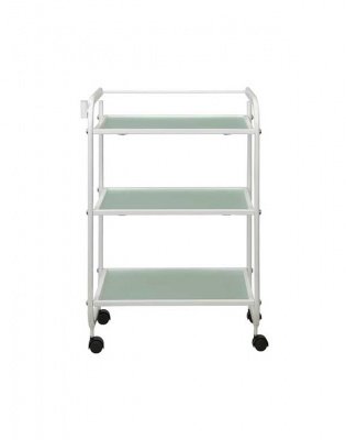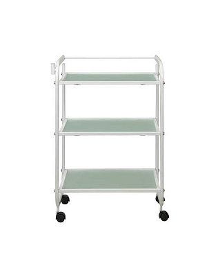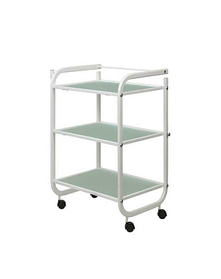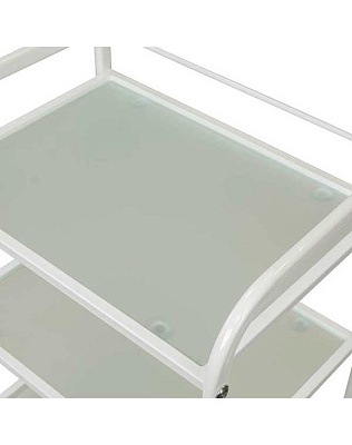 Комплектация: металлический каркас, три стеклянные полки с бортиками, колеса.