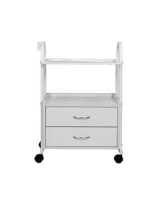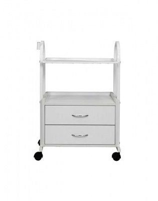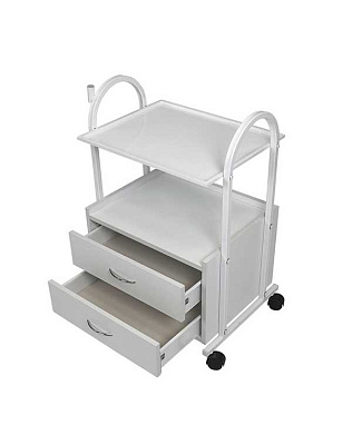 Конструкция косметологической тележки несложная, но весьма функциональная. Во вместительной тумбе с двумя выдвижными ящичками разместятся всё необходимое оборудование, а на верхней полке мастер может разложить принадлежности, использующееся во время рабочего процесса. Бортики на полочке не позволят случайно упасть инструментам на пол. Пространство между полочкой и тумбой можно использовать для хранения такого инвентаря, как высокие бутылки или небольшая косметологическая техника. Комплектация вращающимися колёсами добавляет тележке мобильности – её легко перемещать по рабочему помещению, что весьма удобно. Практичное дополнение – держатель для лампы-лупы, прикреплённый к основе.