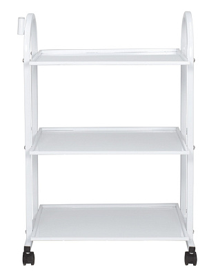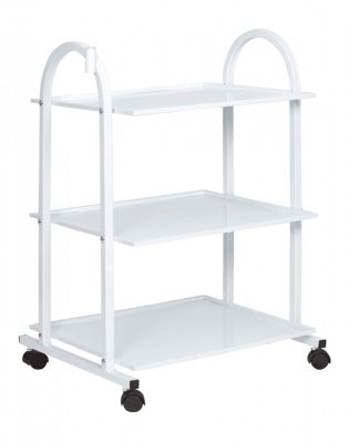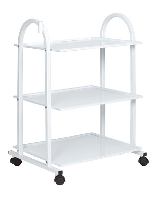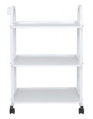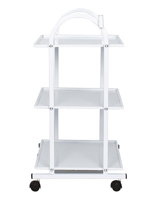 Косметологическая тележка с тремя открытыми полками для оборудования и рабочих материалов мастера. Маневренность конструкции придают вращающиеся колесики из ударопрочного черного пластика. Изогнутые ручки в верхней части позволяют оперативно перемещать столик в пространстве. На металлический каркас нанесена влагостойкая порошковая краска. Покрытие устойчиво к обработке агрессивными дезинфицирующими составами. В верхней части каркаса расположен держатель для лампы-лупы.