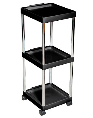 Тележка 6004 выполнена из первичного ударопрочного пластика на металлическом хромированном каркасе. Расстояние между тремя полками идеально подходит для хранения шампуней в зоне мойки. Специальные колесики позволяют легко передвигать тележку.