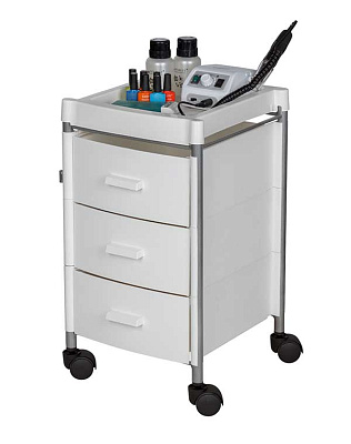 Три ящика вместят все инструменты и расходные материалы, создав порядок на рабочем месте. Верхняя полка имеет отверстия разных диаметров. Здесь мастер может расставить инструменты, необходимые во время проведения процедур. Корпус установлен на поворотные колеса, что обеспечивает плавное и быстрое перемещение тележки по салону.