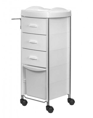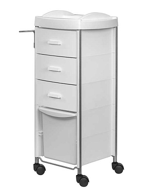 Благодаря продуманной конструкции столик является практичным и вместительным оборудованием. Под приспособления в тележке предусмотрены три ящика. Столик дополнен функциональной крышкой с отверстием для чаш и емкостей. Для быстрого и удобного перемещения по кабинету в тележке предусмотрены маневренные колесики. На углу боковой панели установлен фенодержатель. Нижний глубокий ящик можно использовать в качестве бака для отходов.