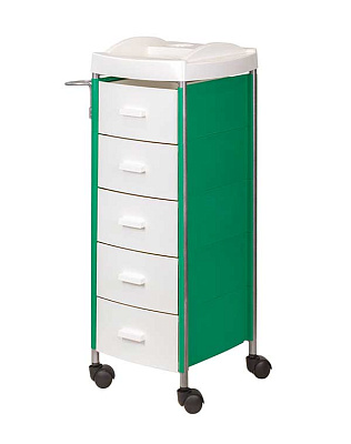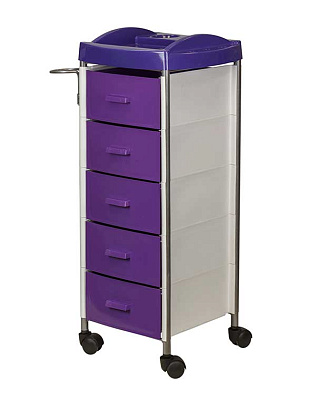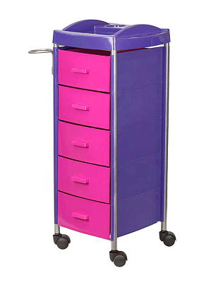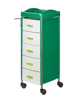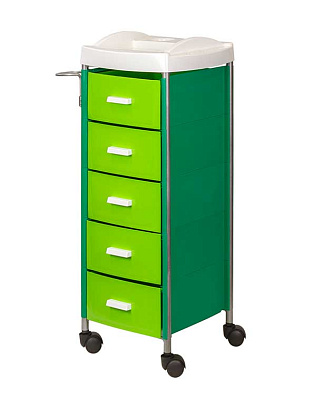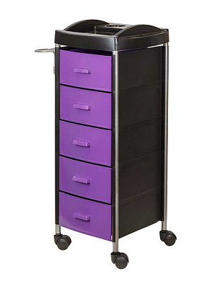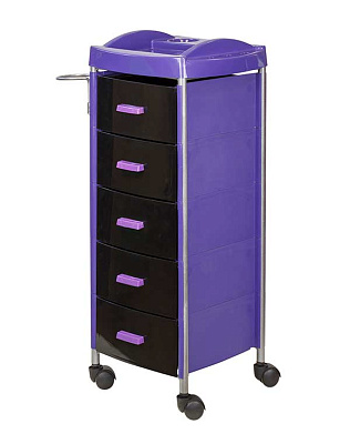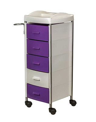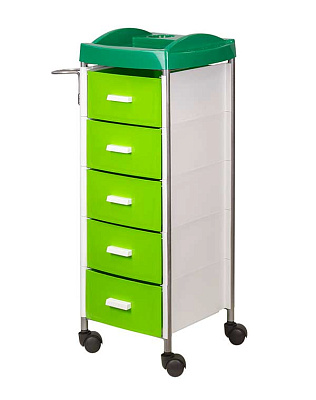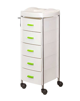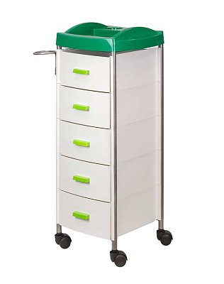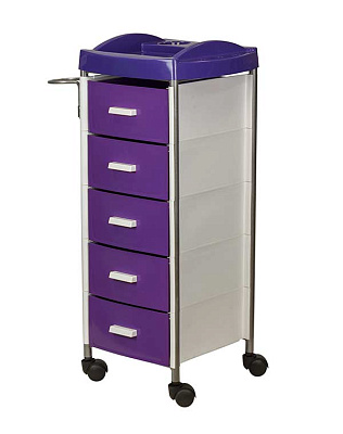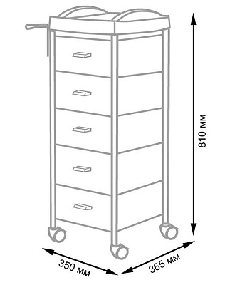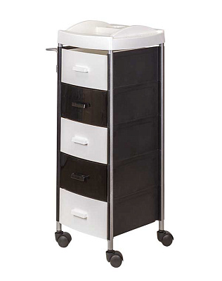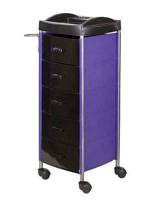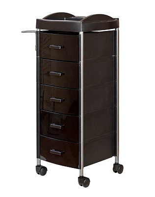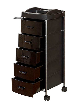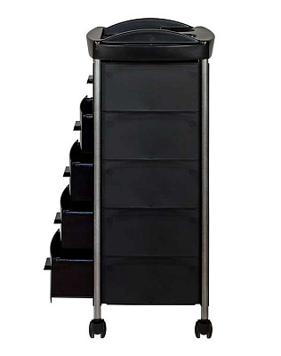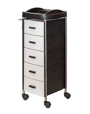 Для инструментов и расходных материалов в парикмахерской тележке есть пять вместительных ящиков. На верхней полке удобно поставить приспособления, используемые в работе. На боковой стене есть удобный держатель для фена. Легкое и бесшумное перемещение обеспечено маневренными колесами.