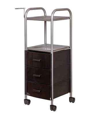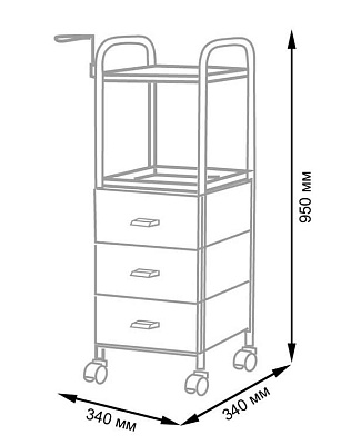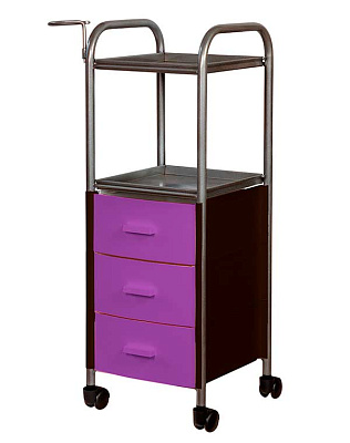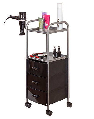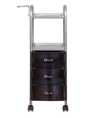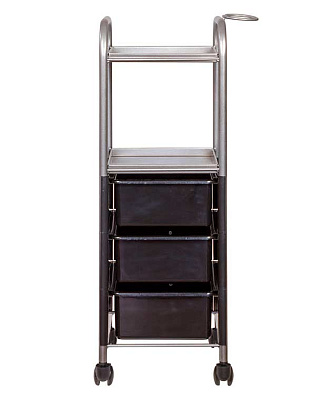 На двух полках достаточно места, что расставить инструменты, аксессуары и расходные материалы первой необходимости. В трех ящиках много места для хранения остальных приспособлений. Удачное дополнение парикмахерской тележки – удобный держатель для фена на боковине. Благодаря встроенным колесикам можно передвинуть тележку в нужное место.