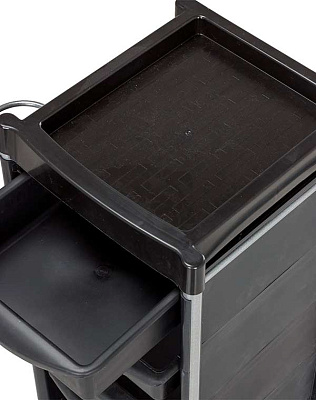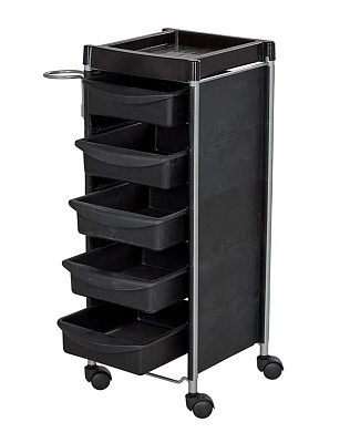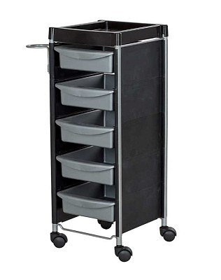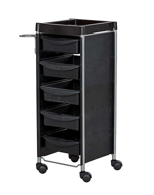Тележку парикмахерскую М-04 в черном цвете рекомендуем использовать для обустройства одного рабочего места парикмахера. В ее конфигурацию входит пять выдвижных ящичков из ударопрочного пластика и удобная верхняя полочка с бортиками. Также модель оснащена металлическим фенодержателем. Тележка занимает немного места.