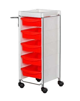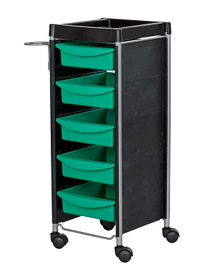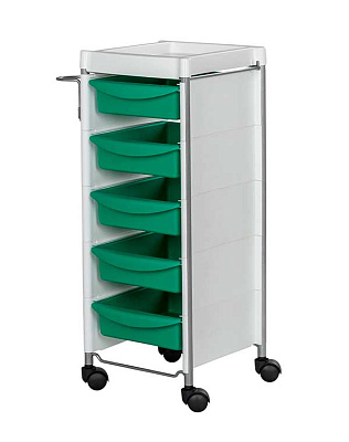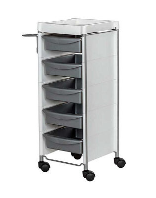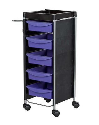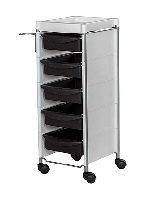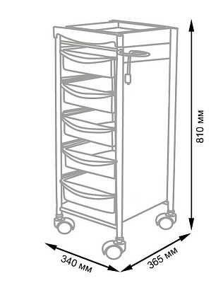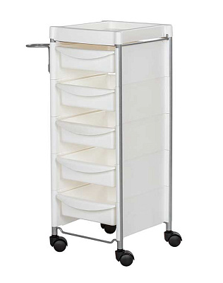 Комплектация: каркас с боковинами на колесах, ящики из пластика (5шт.), пластиковая полочка, держатель для фена, пластиковые боковины.