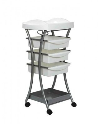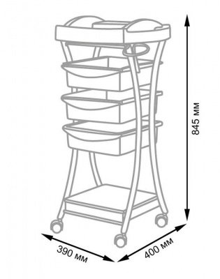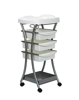 Комплектация: каркас на колесах, три выдвигающихся ящика, верхняя съемная крышка, нижняя полка, фенодержатель.