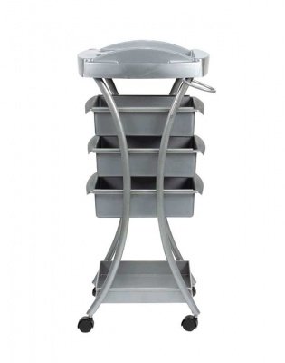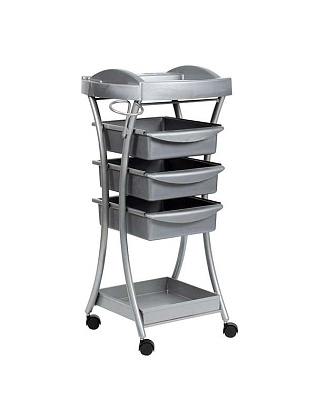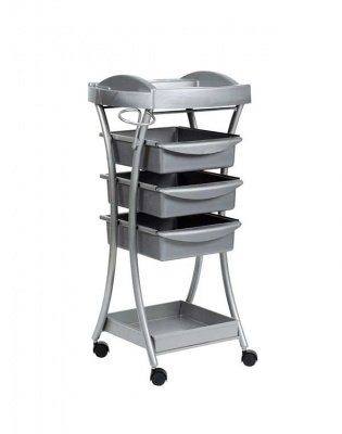 Профессиональная тележка парикмахерская М-08 с черными выдвигающимися ящиками открытого типа и серебристым металлическим каркасом. Вместительные ящики расположены на удобном расстоянии, благодаря чему в них можно хранить как мелкие, так и более крупные приборы, аксессуары, инструменты и прочие принадлежности. На нижней полке будет удобно хранить высокие бутылки с косметическими средствами, которых в арсенале парикмахера немало (пенки для волос, лаки, спреи, бальзамы и т.д.). Функционал модели дополняет верхняя полка с емкостями различной формы и отверстиями.
