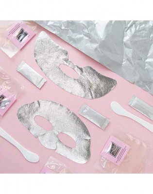 Два компонента маски соединить в емкости и перемешать до растворения порошковой составляющей. Гелевую массу при помощи шпателя нанести на кожу лица, избегая области глаз. Разместить 2 пластины с серебряным напылением поверх маски для фиксации. Пластинки должны располагаться «серебряным» слоем вверх. Время экспозиции составляет 20 минут, после чего необходимо снять пластины и удалить остатки препарата. Обработать кожу лосьоном и нанести крем.