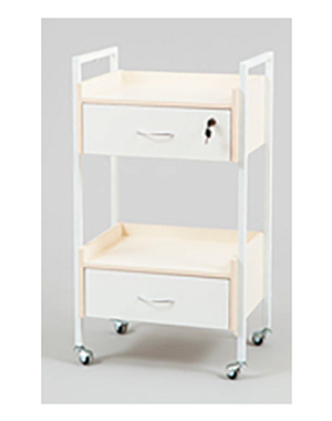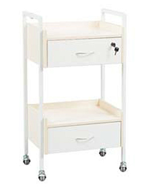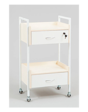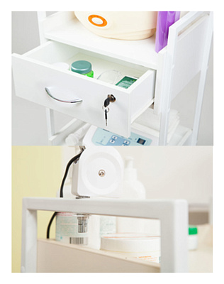 Косметологическая тележка имеет прочный стальной каркас, крепление для лампы - лупы, два ящика, один из которых закрывается на ключ и две полки.
