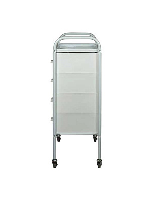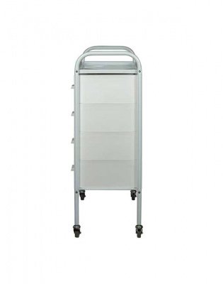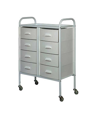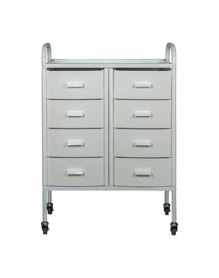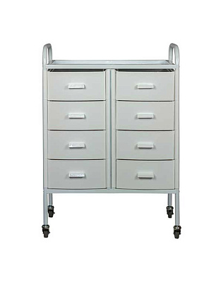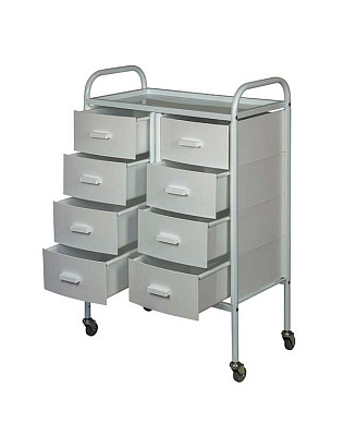 Такое косметологическое оборудование подойдет для организации двух рабочих мест. В распоряжении мастеров 8 выдвижных ящиков для инструментов и расходных материалов. Верхняя полка предназначена для приспособлений, используемых во время проведения процедур. Встроенные маневренные колеса позволят мастеру с легкостью перемещать косметологическое оборудование.