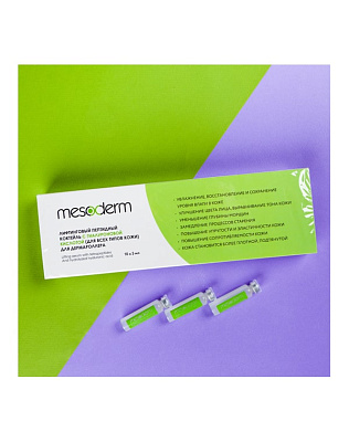 Действующие вещества увлажняющего пептидного коктейля MESODERM улучшают цвет лица, уменьшают выраженность морщин, складок и пигментации.