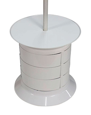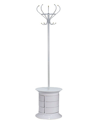 Вешалка для одежды GiroCo Raul white – стильное и функциональное оборудование для салона красоты. Мебель для холла в белом цвете – актуальное решение для любого интерьера. Вешалка дополнена удобной тумбой с девятью ящиками. Вращающиеся колеса обеспечивают мобильность. Такое оборудование не займет много места и подойдет для небольших помещений.