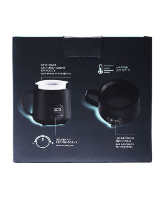 • Дополнительный съемный стаканчик из силикона помогает разогревать воск или парафин без последующего мытья всего прибора, при этом не влияет на его рабочие характеристики. Выдерживает температуры до 1800С.